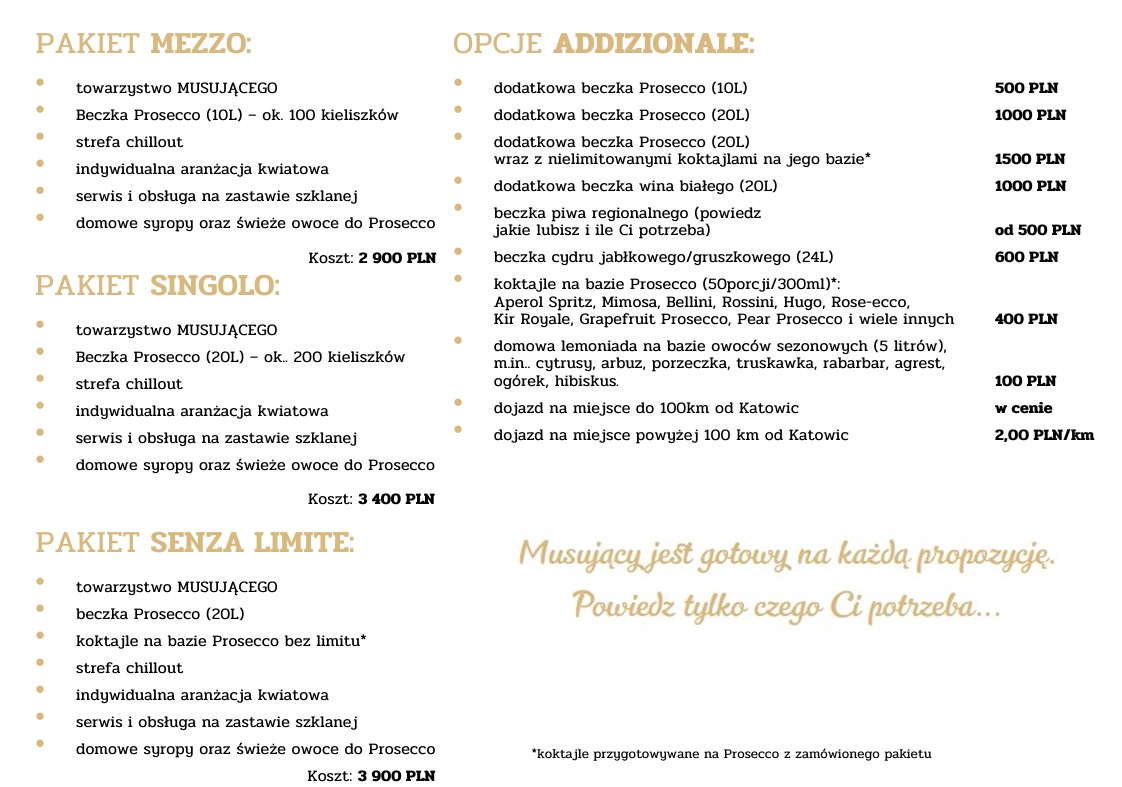 beczkę Prosecco (10L oraz 20L); - Prosecco zawsze serwowane jest na zastawie szklanej